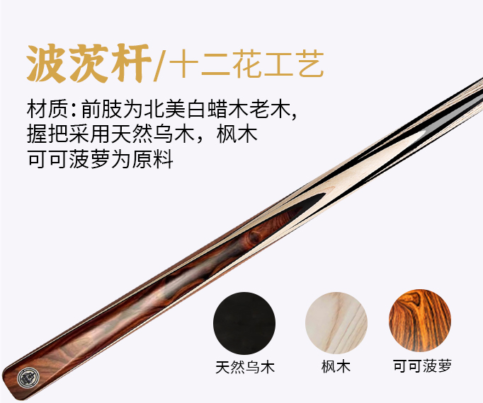 握把采用天然乌木,枫木,可可菠萝木为原料,天然木质,精美剑纹,优质职业杆头坚韧耐用,给力更直接